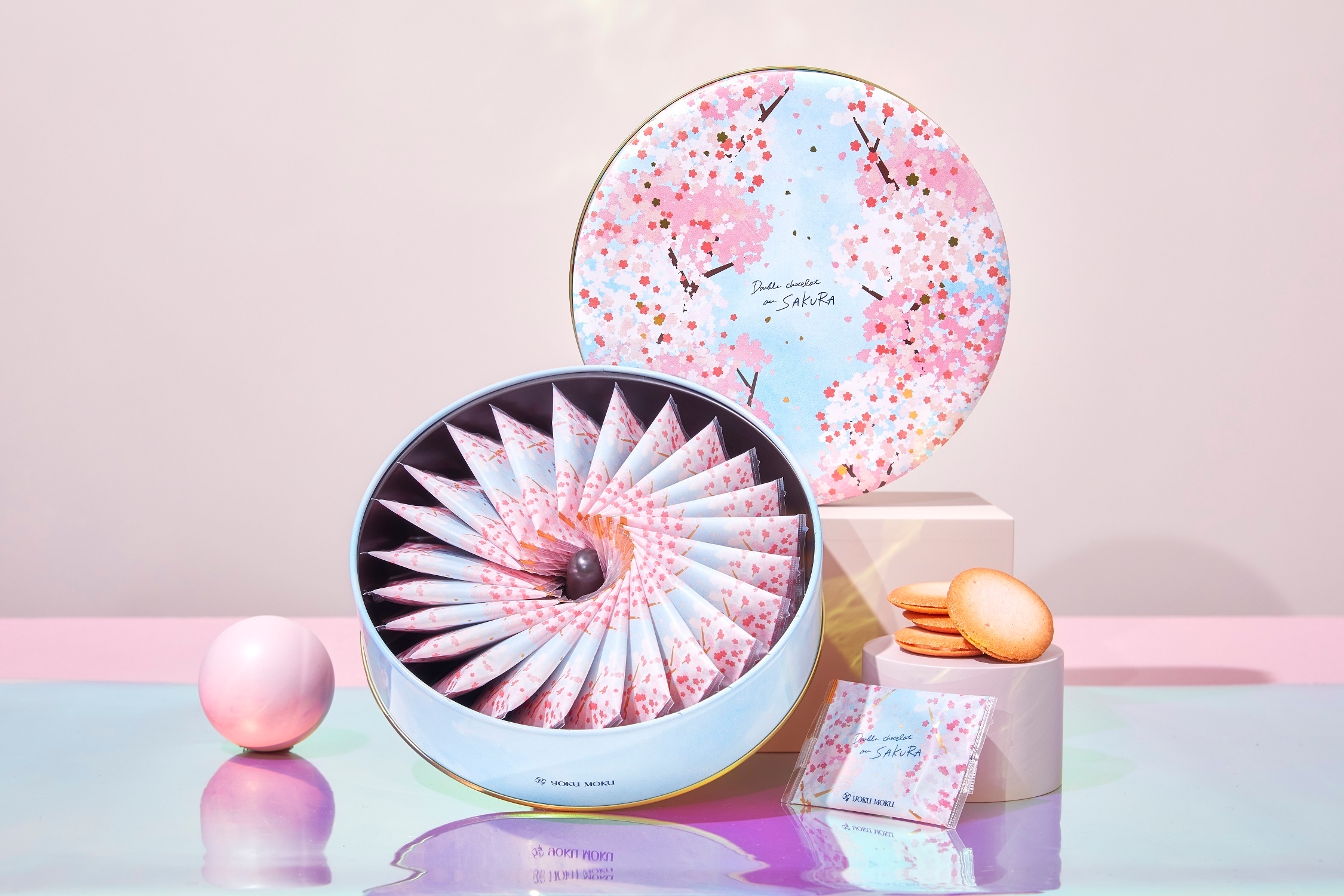 桜香るはらりと口溶けの良い食感に焼き上げたラングドシャーで、桜風味のチョコレートをサンドしました。春の心地よい陽気を感じさせる青空と桜のコントラストが美しい、満開の桜の並木道を多角的な視点で描かれたパッケージデザインです。
