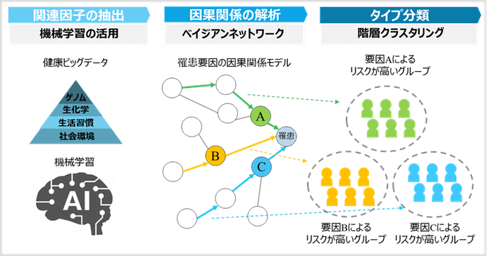 しかしながら、健康ビッグデータ解析による病気の罹患リスクの高い特徴の特定にあたり、今回用いるデータが約3000項目×数千、数万人と膨大なデータ量となるため、一般的な相関解析やクラスタリング手法を適用するだけでは罹患リスクの特徴の抽出や、その関係性の把握が困難でした。