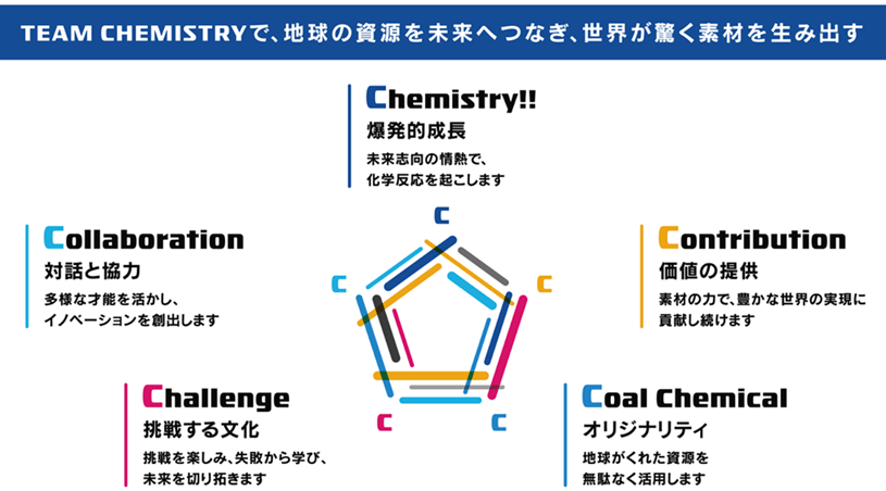 そのような思いを胸に、“Chemistry!!”を中心に、“Collaboration”、“Contribution”、“Coal Chemical”、“Challenge”という5つのCを原動力として、ビジョンを達成していきます。
