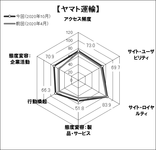 第2位の「ヤマト運輸」はWBIが10.6ポイント上昇し500サイト全体の順位でも、前回の第20位から第8位へと大きく順位を上げた(図表4)。6つの個別指数全ての評価項目でスコアが上昇。特に「態度変容:企業活動」では、14.7ポイント上昇し、70.9ポイントという結果となった。個別の項目では「運営主の事業活動、技術や取り組みに関心を持った」「運営主が気に入った、好きになった」が上昇しており、企業の取り組みに対する関心の高さが伺える。