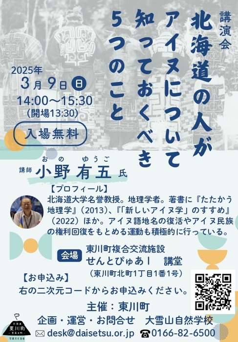 【北海道 東川町】3/9(日) 北大名誉教授 小野有五氏による講演会「北海道の人がアイヌについて知っておくべき5つのこと」開催!!