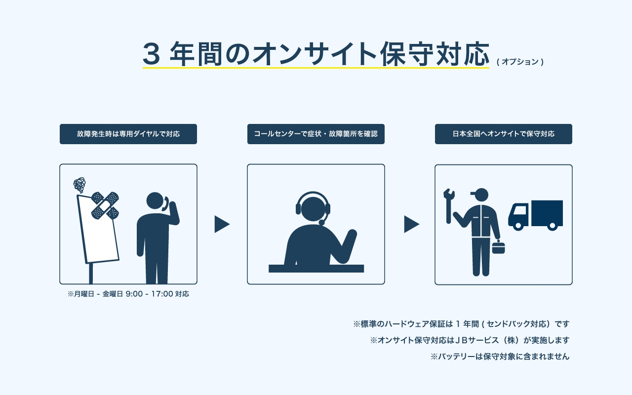 保守パートナーであるJBサービス株式会社(本社:東京都中央区、代表取締役社長:三星 義明)による、電話対応+オンサイト保守を行う3年間の拡張保守サービスを追加することが可能です。導入後に予期せぬ故障が発生しても、日本全国に拠点を持つJBサービスの障害受付コールセンターにて受付し、迅速に対応いたします。