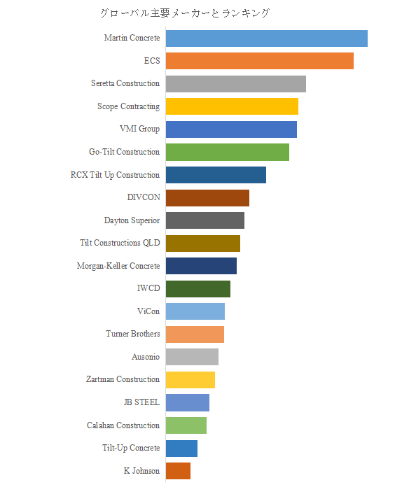 YHResearchのトップ企業研究センターによると、コンクリートティルトアップ施工サービスの世界的な主要製造業者には、Martin Concrete、ECS、Seretta Construction、Scope Contracting、VMI Group、Go-Tilt Construction、DIVCON、RCX Tilt Up Construction、Dayton Superior、Tilt Constructions QLDなどが含まれている。2024年、世界のトップ10企業は売上の観点から約5.0%の市場シェアを持っていた。