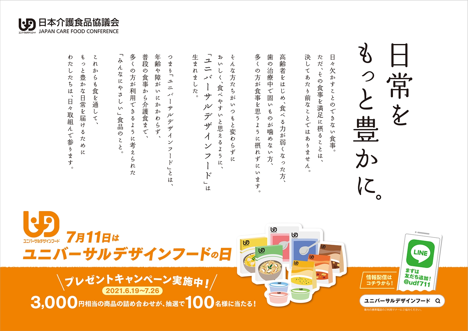 日本介護食品協議会(所在地:東京都千代田区、会長:森 佳光(キユーピー株式会社 執行役員 広報担当)は、来る7月11日の「UDF(ユニバーサルデザインフード)の日」を記念した普及活動を実施します。