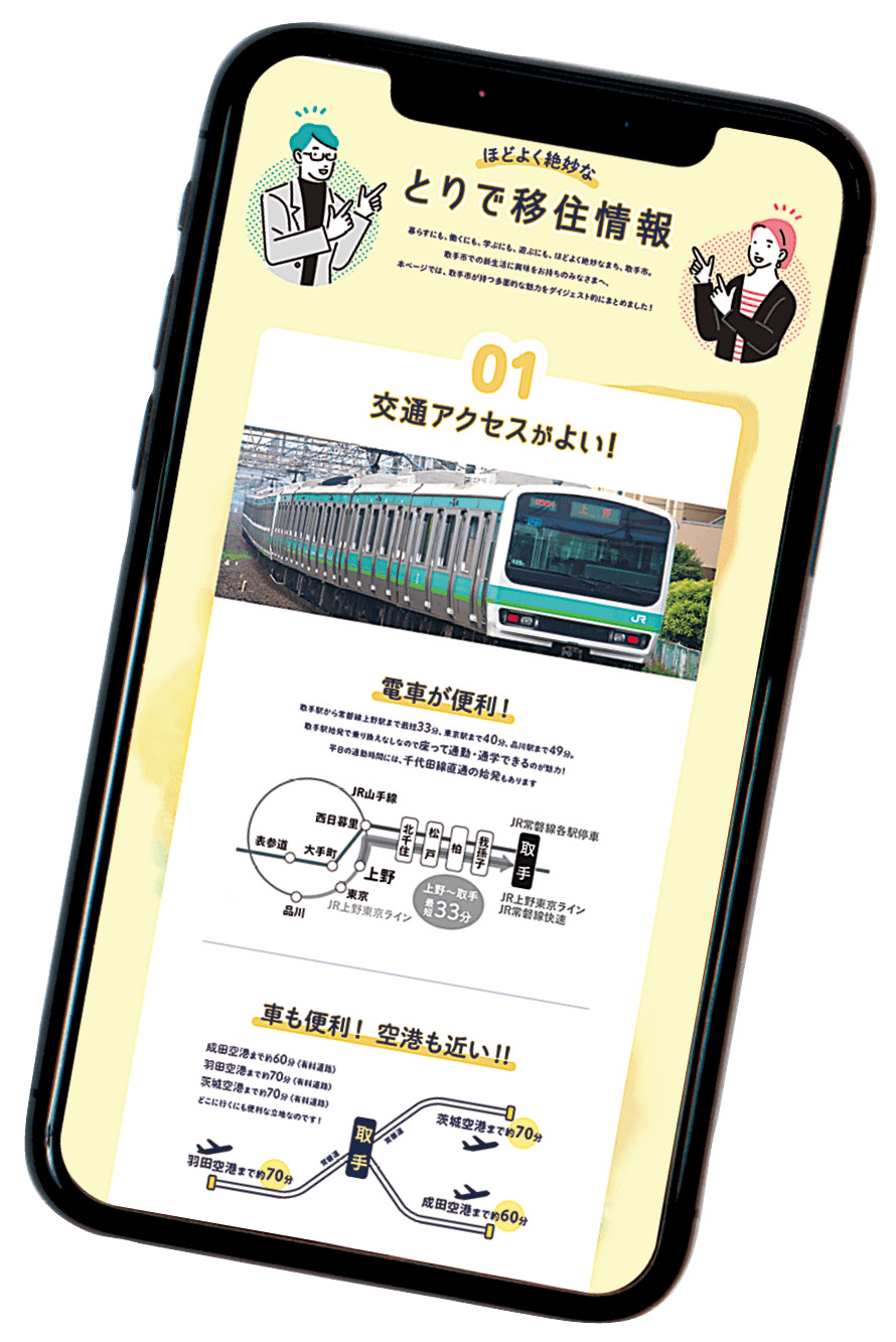 市から都心への交通アクセスや、補助金、子育て世帯への情報などを掲載しています。取手市での新生活に興味をお持ちのみなさまへ取手市が持つ多面的な魅力をダイジェスト的にまとめました。