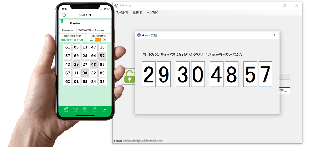 「クリプタン」とは、軍事レベルの暗号方式AES256と公開鍵暗号方式に、パスロジが提供する認証と証明のプラットフォーム「4Login(フォーログイン)」(以下、4Login)による100%認証セキュリティ技術を組み合わせたWindows用ファイル暗号化ソフトです。送信者があらかじめ設定した「正しい相手にしか開けない」世界初の高度な暗号化(国際特許出願中)を実現し、脱PPAPを簡単かつ確実に実現します。