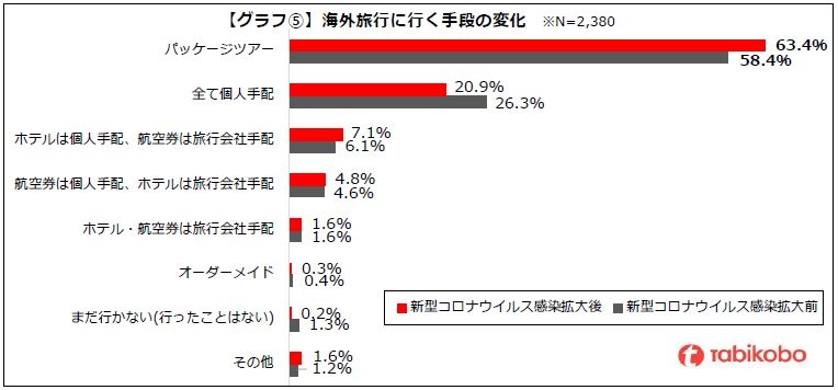 また、新型コロナウイルス感染拡大前との比較では、「パッケージツアー」が5.0ポイント増加し、「個人手配」が5.4ポイント減少しました。フリー回答では、海外の新型コロナウイルスの感染状況やウクライナ情勢を気にかける声もあり、旅行会社のサポートを求める傾向がうかがえました。※グラフ⑤参照