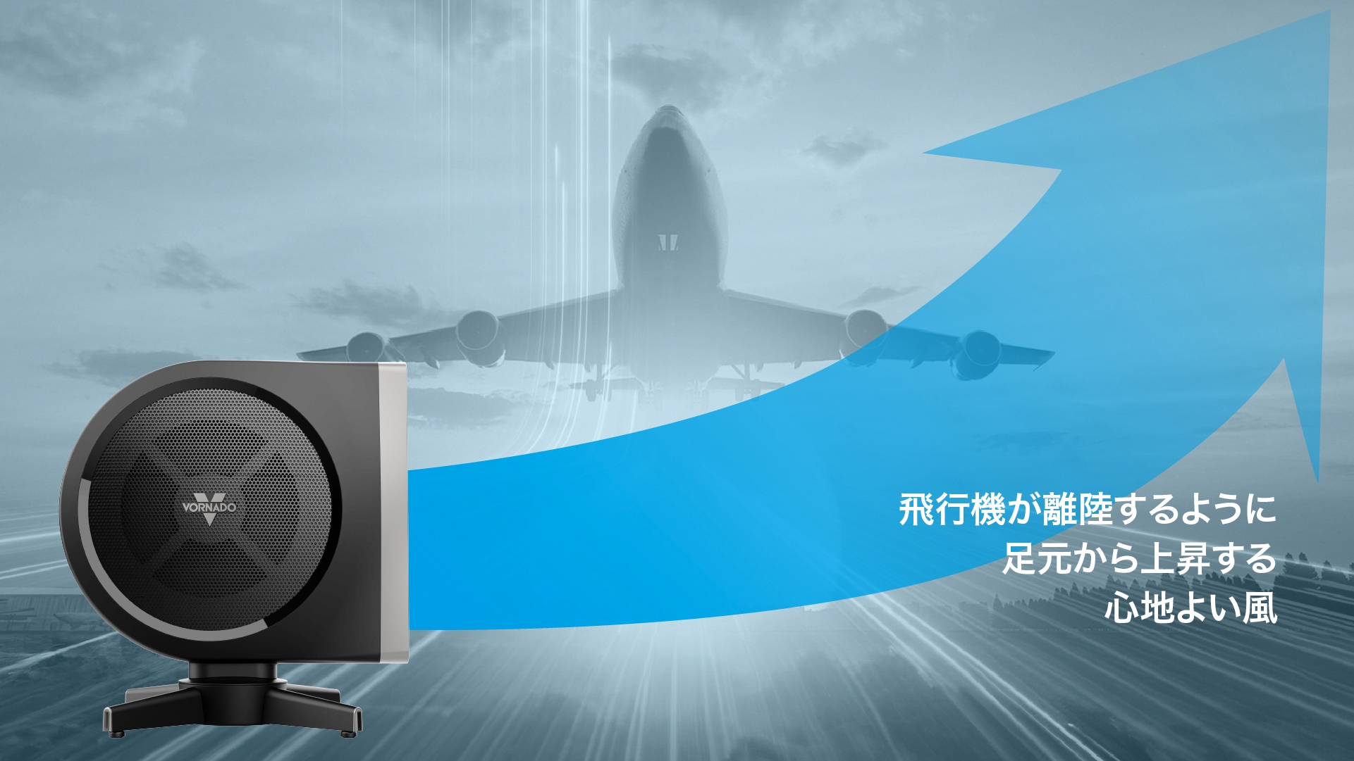 STRATA-JPは、超薄型で独自のブロワー(送風機)を装備。このブロワーにより、ボルネードサーキュレーター最速の風を実現。ブロワーから吹き出す高速風は、航空機が離陸するように斜めに上昇していきます。