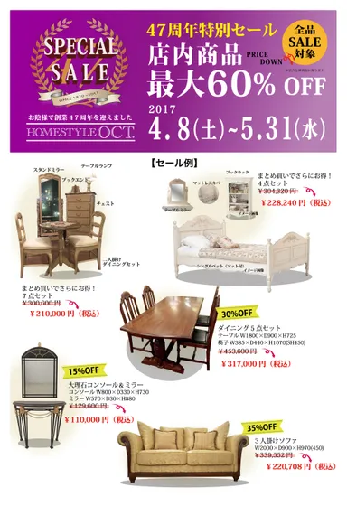 創業47年のインテリアショップ「ホームスタイルオクト」 最大で60%OFFのプライスダウンセールを開催
