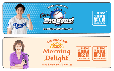 【TOKAI RADIO】山﨑武司・海蔵亮太・上野大樹をゲストに迎え公開収録 8/30(土)イオンモールナゴヤドーム前にて実施