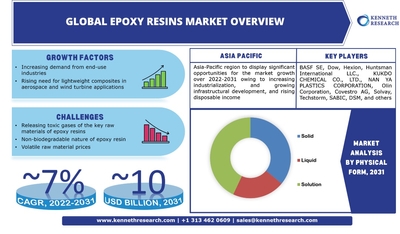 世界のエポキシ樹脂市場の成長は、最終用途産業からの需要の増加と、航空宇宙における軽量複合材料のニーズの高まりによって推進され、2022年から2031年の間に約7%のCAGRで推進される