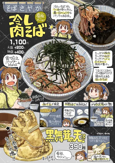 汐留の立ち食いそば「そば さやか」店頭ポスターが4月2日登場! 食レポ漫画家・なぐもさんが描く「冷し肉そばの食べ方マンガ」