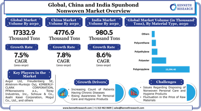 世界、中国、インドのスパンボンド不織布市場は、月経衛生状態の悪化に対する懸念の高まりを背景に成長します。市場は2021年から2030年の間に、グローバル、中国、インドでそれぞれ7.5%、7.8%、8.6%のCAGRで成長する