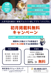 【初月掲載料無料キャンペーン】スポットワーカー活用で人手不足対策!飲食・接客サービス業界特化の単発バイトアプリ”バリプラ”にて、企業様向けの「初月掲載料無料キャンペーン」を開始いたしました。