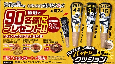 タイガース レジェンズコラボ グルメキャンペーン第三弾を開催 ~ランディ・バース氏、掛布雅之氏、岡田彰布氏を デザインした「バックスクリーン3連発 バット型クッション」を90名様にプレゼント~