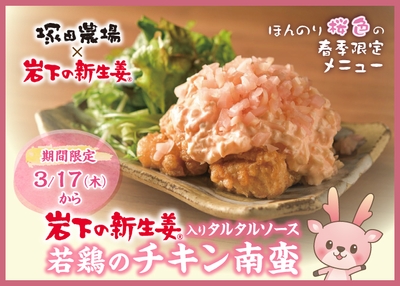 「塚田農場」に岩下の新生姜でほんのり桜色の春季限定メニュー『岩下の新生姜入りタルタルソース 若鶏のチキン南蛮』が登場。全国で3月17日から期間限定で提供。