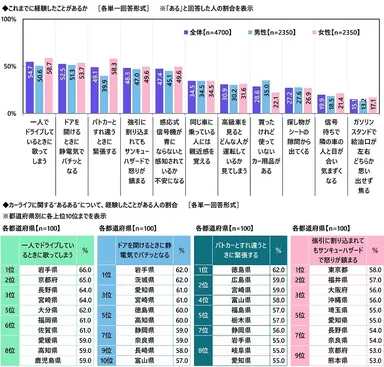 【カーライフ“あるある”経験率】 1位「一人でドライブしているときに 歌ってしまう」54.7%、 2位「ドアを開けるときに静電気でバチッとなる」52.5%、 3位「パトカーとすれ違うときに緊張する」49.1% (アクサ損害保険調べ)