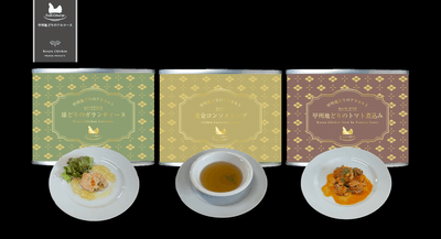山梨県ご当地缶詰「甲州地どりのフルコース」缶詰でおうちで豪華気分を満喫!本格的な前菜・スープ・メインディッシュを味わえる甲州地どりプレミアム缶詰3種が新登場