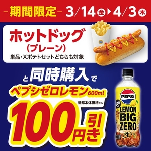 ホットドッグと人気ドリンク合わせて買うとお買い得 ホットドッグ(プレーン)とペプシゼロレモン600ml同時のご購入で 通常本体価格から100円引き 3月14日(金)~4月3日(木)期間限定!!