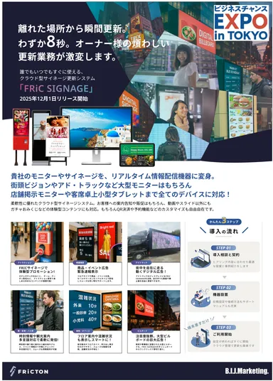 業界初、離れた場所からわずか8秒で瞬間更新。 大型ビジョンやアドトラックなど街頭大型サイネージはもちろん 店内モニターや卓上タブレットなどあらゆるシーンで対応。 最新鋭クラウド型遠隔サイネージ更新管理ツール 『FRiC SIGNAGE』が12月1日よりリリース開始。