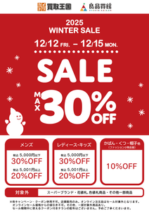 【2025 WINTER SALE】 最大30%OFF開催!買取王国・良品買館では、お手頃価格のリユース品が更にSALE価格でお買い求めできる衣料品WINTER SALEを、12月12日(金)から店舗限定で開催いたします。