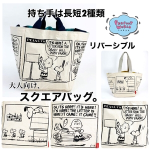 SNOOPYの4コマデザインが可愛い、大人向けMEDIUMスクエアバッグ。リバーシブルで持ち手も長短の2種類、大人っぽいカラーリングで上品さとナチュラルさをプラスしました♪