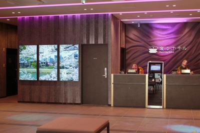 京都初開業となる「変なホテル」に大型55インチの「Atmoph Window Up」が導入。3台の迫力のパノラマで、四季折々の美しさを。