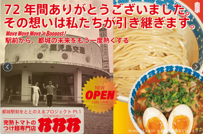 【宮崎】都城駅前再生プロジェクト始動!完熟トマトつけ麺専門店「乃乃乃」2026年1月オープン。クラウドファンディングで300万円の支援募集開始!
