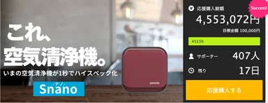 オゾン放出+空気清浄の2役が手のひらサイズで実現! 販売開始72時間で300万円売り上げた フィルターレス空気清浄機「Snano」を4/23まで販売