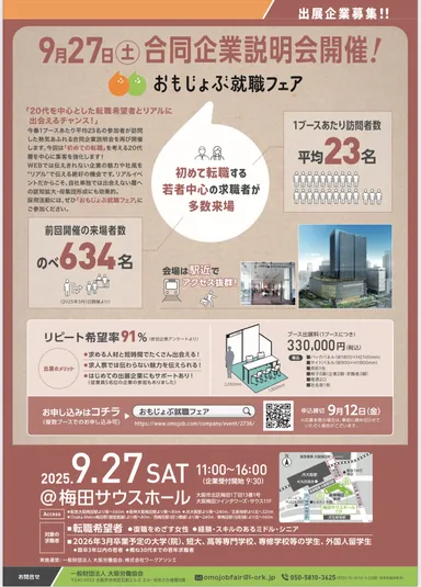 「おもじょぶ就職フェア」9/27(土)@梅田サウスホール 出展企業募集!