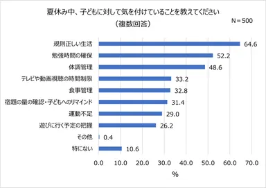 子どもとの夏の思い出を調査!パパママ500名が回答。 親子の夏休み、楽しかったこと1位「国内旅行」。 今年も4割以上が「国内旅行」に行きたい! 夏休み中、6割以上の親が子どもの「規則正しい生活」を意識。 祖父母や親戚からのお小遣い 相場は「3,000円以上~5,000円未満」。 親子の夏休みあるある10選「お昼ご飯が麺類になりがち」