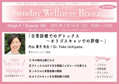 《医師・歯科医師・薬剤師向け》 無料オンラインセミナー2/16(日)朝10時開催 『日常診療でのデトックス~オリゴスキャンでの評価~』 講師:内山 葉子 先生(葉子クリニック/院長)