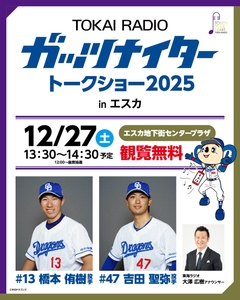 【TOKAI RADIO】中日ドラゴンズ 橋本侑樹・吉田聖弥 出演の「ガッツナイター トークショー」12/27(土)名古屋・エスカで開催 観覧無料