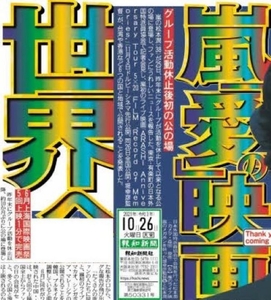 【スポーツ報知】1面に「嵐“愛”の映画世界へ」【10月26日(火)付】