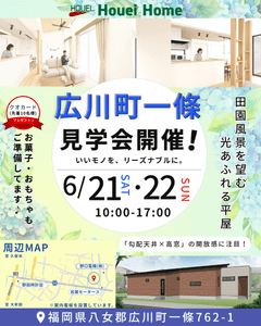【福岡県広川町】ホーエーホーム「田園風景を望む光あふれる平屋」完成見学会を開催!6/21(土)~6/22(日)