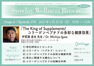 《医師・歯科医師・薬剤師向け》 無料オンラインセミナー5/25(日)朝10時開催 『The King of Supplements! コラーゲンペプチドの多彩な健康効果』 伊賀瀬 道也 先生(愛媛大学医学系研究科 抗加齢医学(新田ゼラチン)講座 / 教授)