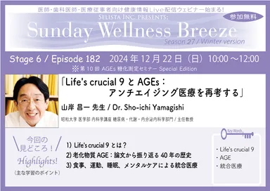 《医師・歯科医師・薬剤師向け》 無料オンラインセミナー12/22(日)朝10時開催 『Life's crucial 9とAGEs:アンチエイジング医療を再考する』 講師:山岸 昌一先生(昭和大学 医学部 内科学講座 糖尿病・代謝・内分泌内科学部門/主任教授)