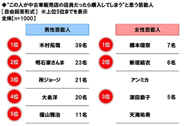 ホンダアクセス調べ “この人が中古車販売店の店員だったら 購入してしまう”と思う芸能人 男性芸能人1位「木村拓哉さん」 2位「明石家さんまさん」、 女性芸能人1位「橋本環奈さん」 2位「新垣結衣さん」