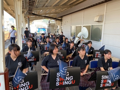 特別急行列車「WEST EXPRESS 銀河」到着を記念したおもてなし企画 近大附属新宮高・中吹奏楽部が「ウェルカム演奏」で観光客を歓迎