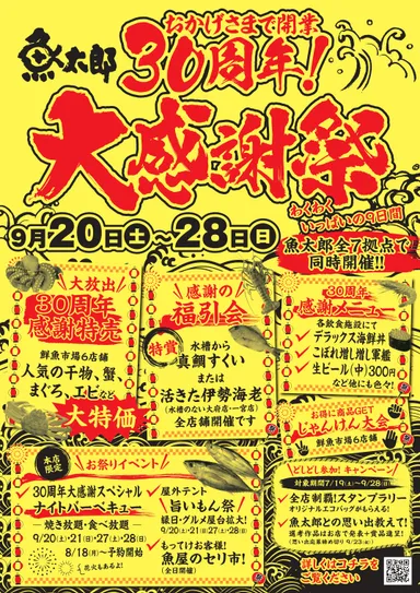 魚太郎、創業30周年の感謝を込めた“大感謝祭”を 全7店舗で同時開催 開催日 2025年9月20日(土)から9月28日(日)