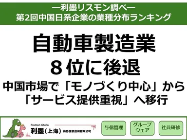 「第2回中国日系企業の業種分布ランキング」結果を発表 ~自動車製造業が8位に後退、 中国市場で「モノづくり中心」から「サービス提供重視」へ移行~