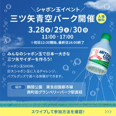 全長4mの巨大サイダーが空に浮かぶ! みんなで楽しめる無料のシャボン玉イベント 「三ツ矢青空パーク」、 「三ツ矢の日」3/28から鶴間公園で開催! 生田絵梨花×SHISHAMO YouTubeスペシャルトークLIVE実施