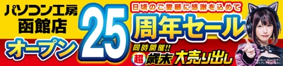 オープン25周年を迎えたパソコン専門店【パソコン工房 函館店】にて 12月14日(土)より「函館店 オープン25周年記念セール」を開催! 「オススメ即納パソコン」を豊富に取り揃え!更に 「PCパーツ・周辺機器等のセール商品」を記念プライスにてご奉仕!