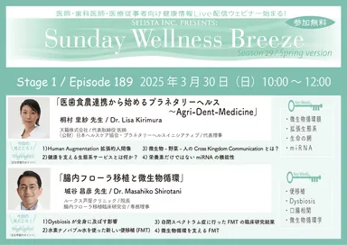 《医師・歯科医師・薬剤師向け》 無料オンラインセミナー3/30(日)朝10時開催 『医歯食農連携から始めるプラネタリーヘルス ~Agri-Dent-Medicine』 講師:桐村 里紗 先生(天籟株式会社 / 代表取締役 医師) 『腸内フローラ移植と微生物循環』 講師:城谷 昌彦 先生(ルークス芦屋クリニック / 院長)